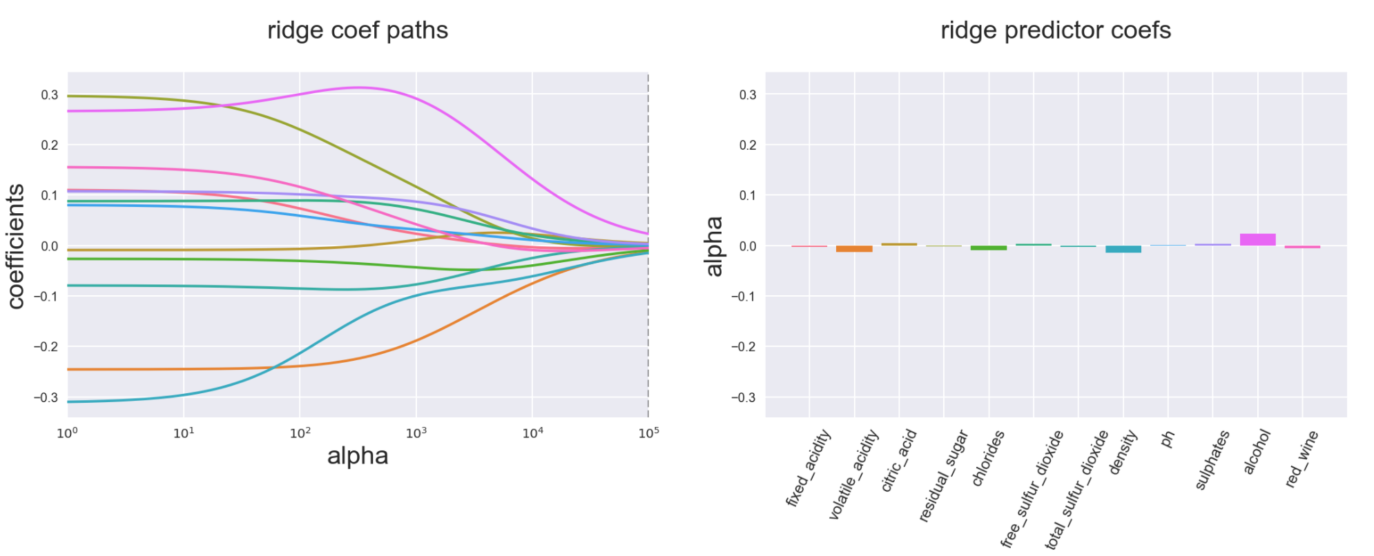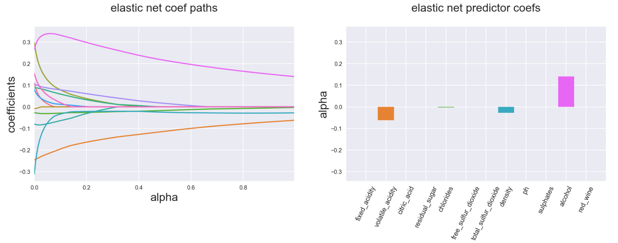 A few more illustrations of how Ridge, Lasso and Elastic Net affect the coefficients compared to simple Linear Regression (based on the wine quality data set that can be found here )
