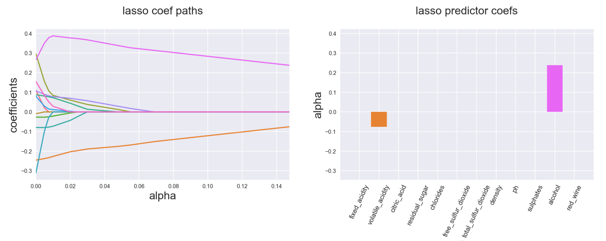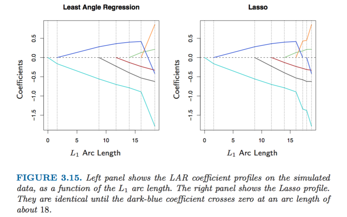 We can see that evolution of coefficients in case of LAR and Lasso is very similar except for when a coefficient’s value approaches zero. In that case it’s dropped out of Lasso estimation but continues smoothly in the case of LAR