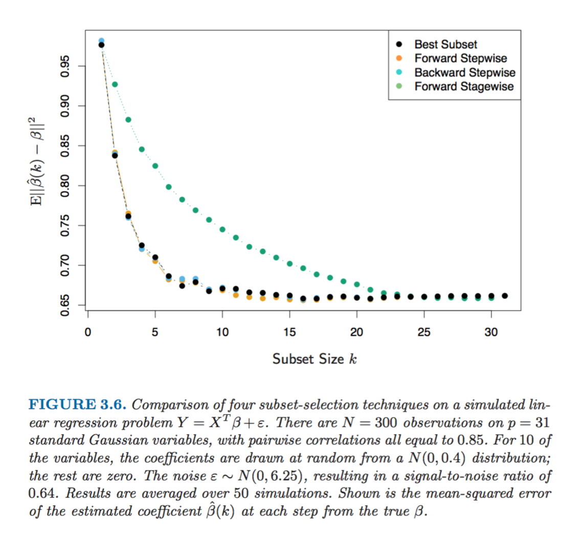 Forward-stagewise regression is even more constrained than forward-stepwise above. It starts like forward-stepwise regression, with an intercept equal to the mean, and then at each step the algorithm identifies the variable most correlated with the current residua, then computes the simple linear regression coefficient of the residual on this chosen variable, and then adds it to the current coefficient for that variable. This is continued till none of the variables have correlation with the residuals. Although this is the slower algorithm than the other options (it takes more time to arrive at the same optimal solution) it is nevertheless pretty handy in higher dimensions problems