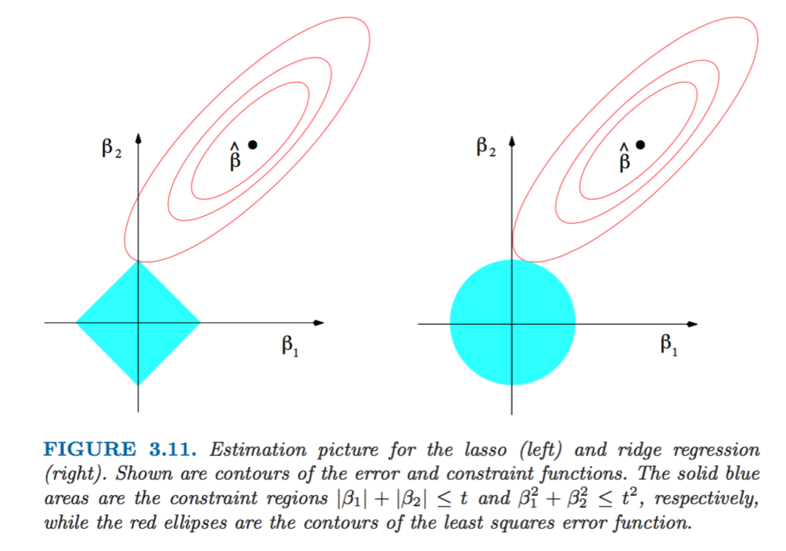 From this illustration we can see that Lasso is more likely than Ridge to get a “corner” solution with one of the betas being zero: